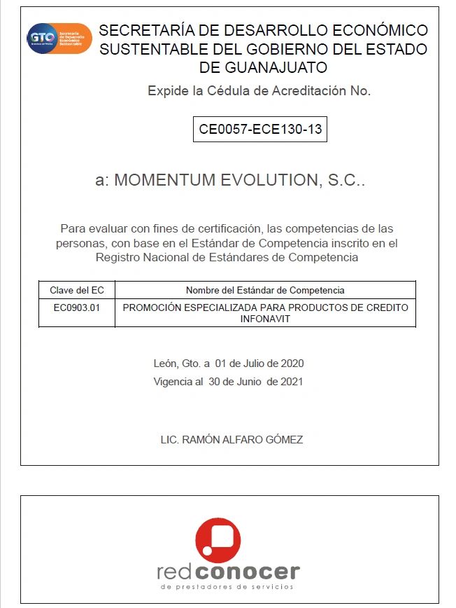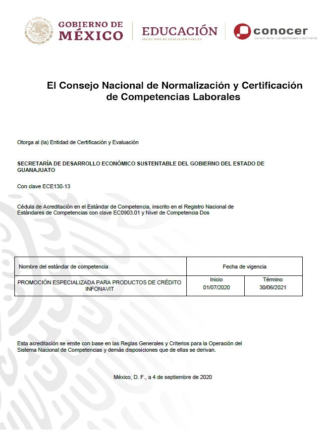 Certificación de competencia laboral del sistema CONOCER /SEP del Gobierno Federal. EC0903.01 Actualización "Promoción especializada para productos de crédito infonavit"